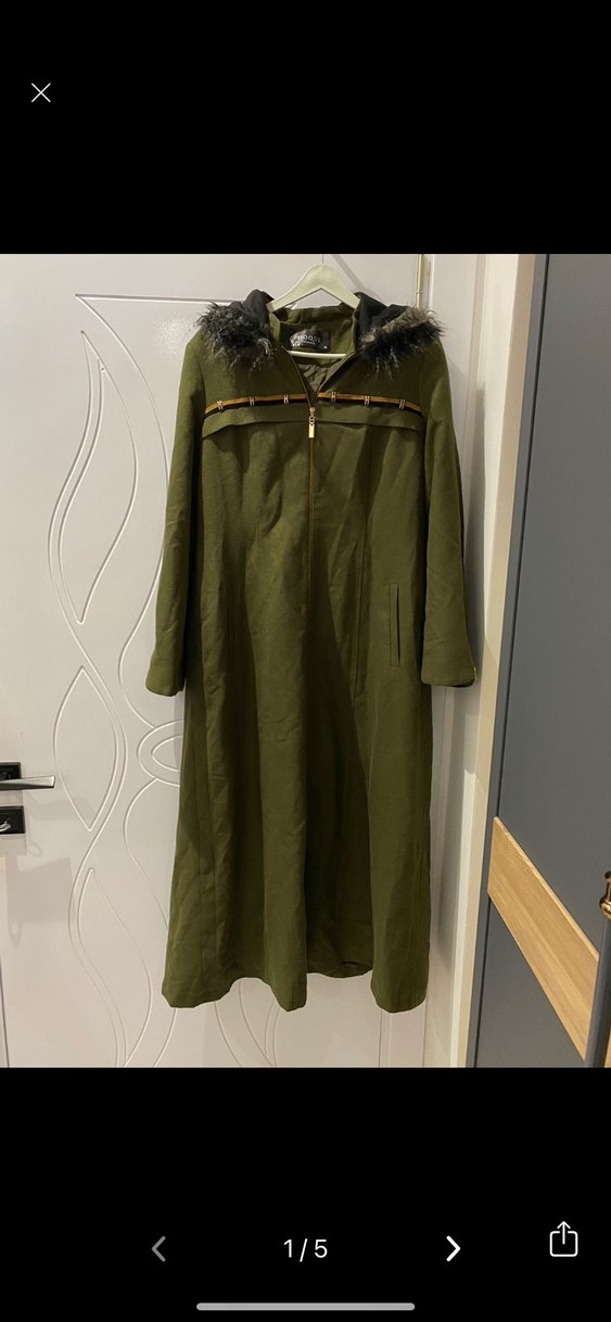 Kadınlar için uzun kesim haki kaban, suni kumaş ve kürk detaylı. Açık yaka, regular fit ve uzun kolludur. Defosuz urun yepyeni