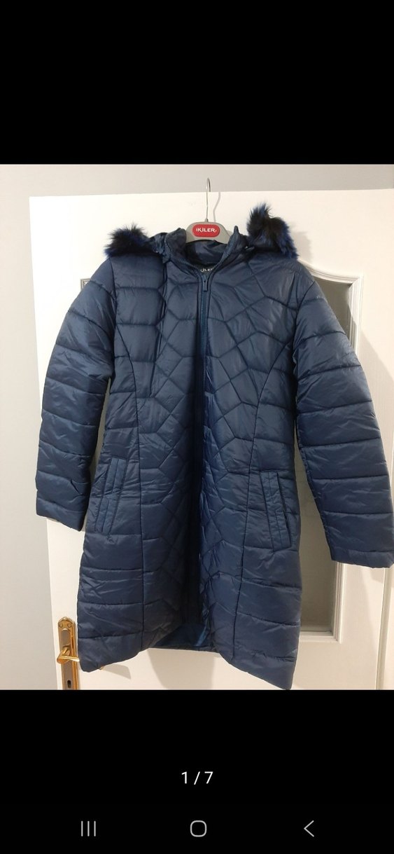 Uzun kesim, kürklü kapüşonlu kadın kışlık mont. lacivert renkte, sentetik kumaştan, regular fit ve uzun kollu, sokak stiline uygun. giyilmemiştir yeni