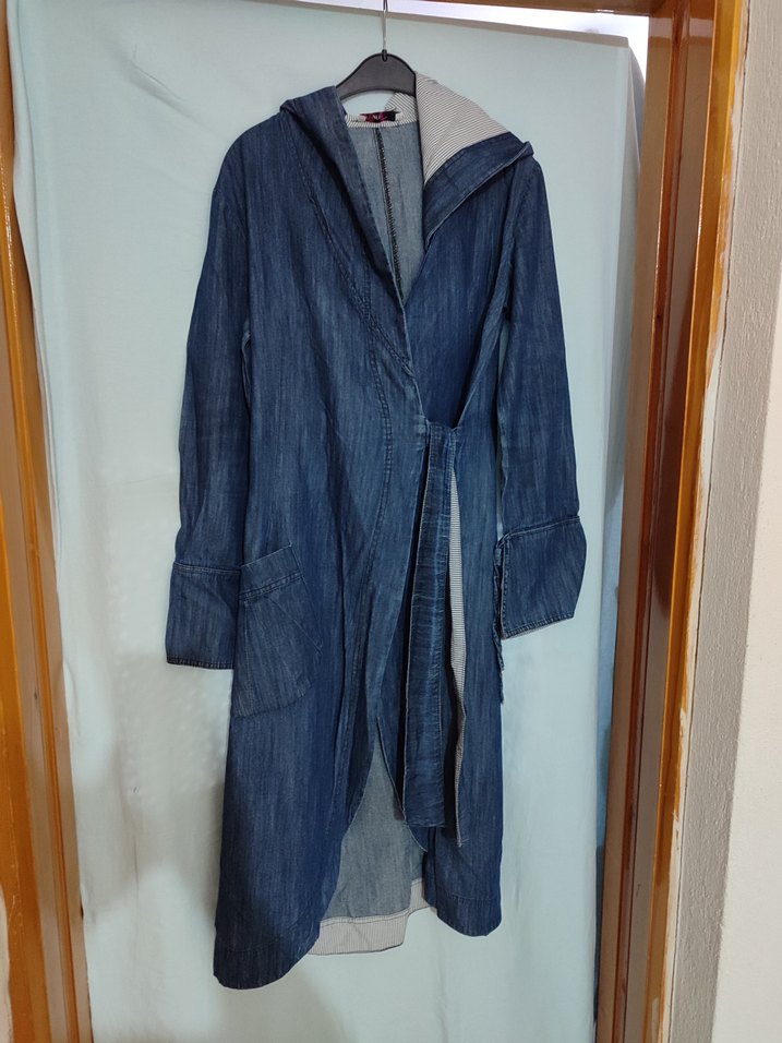 Uzun kesim, bol kesim kot ceket. Notch yakalı, drapeli ve uzun kolludur. Günlük rahat kullanıma uygundur. Desensiz ve mavidir.