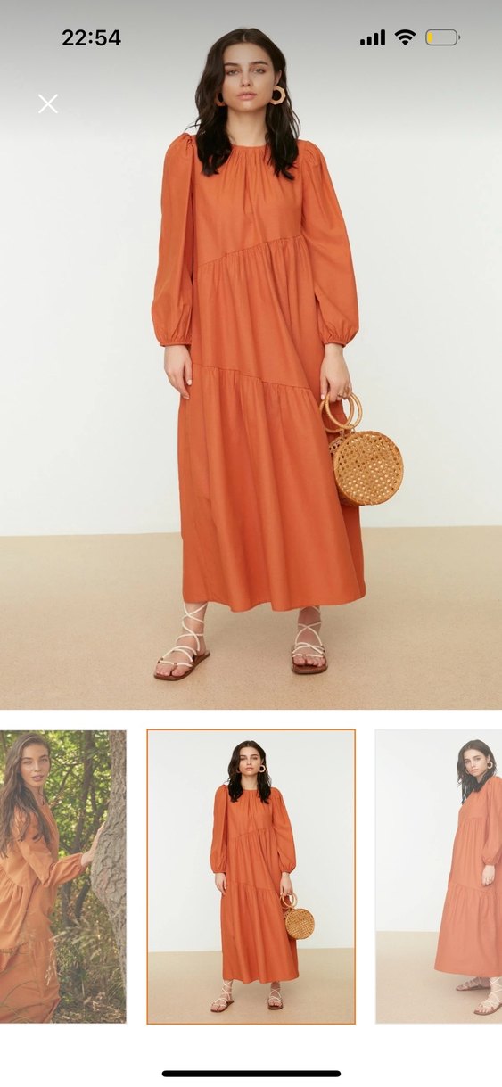 Kamel renginde uzun kesim, salaş fit ve tekne yaka bir elbisedir. Yumuşak sentetik kumaştan üretilmiş, ince askılı kollar ve minimalist bohem tarzı ile günlük kullanıma uygundur. Tertemiz yeni gibi