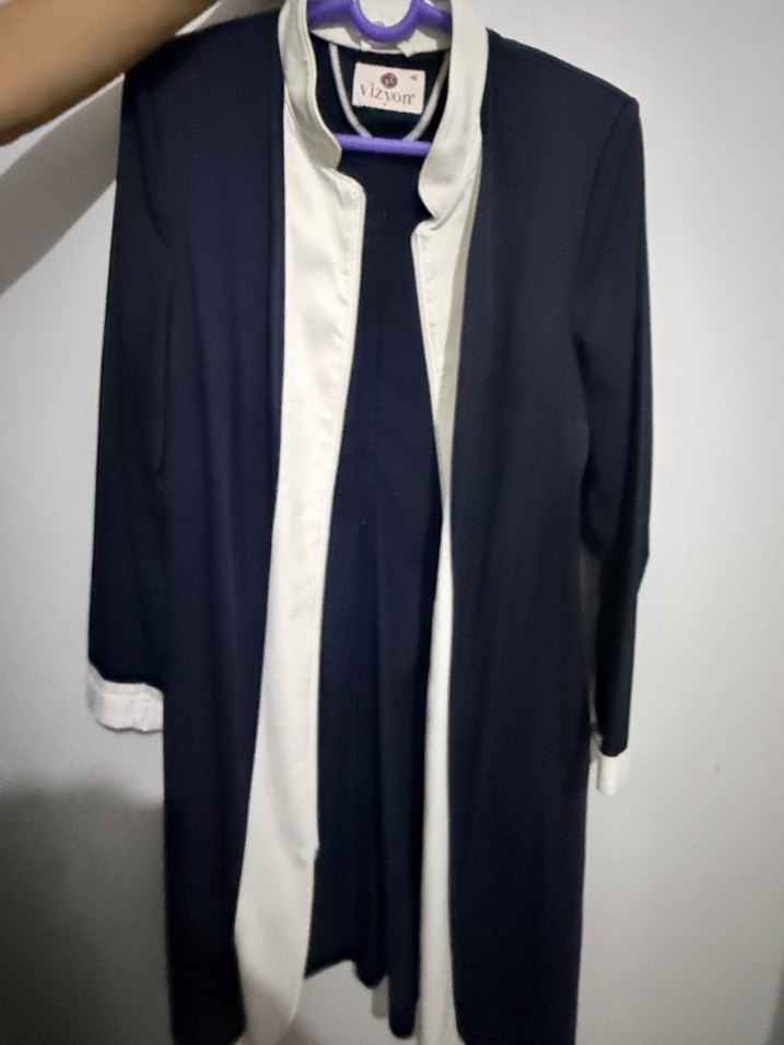 Uzun kesim, uzun kollu kadın kaban. Klasik yakalı, drapeli tasarım. Koyu ve beyaz renklerde, sentetik kumaştan üretilmiştir. Ofis ve günlük kullanım için uygundur.
