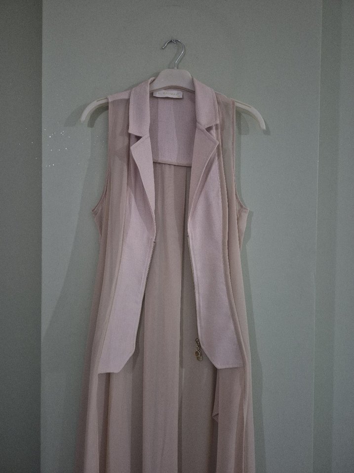 Kolsuz, uzun kesim bej renkli bu yelek, askısız yakası ve dökümlü tasarımıyla dikkat çeker. İpek gibi kumaştan yapılmış, rahat kesim ve çağdaş stile sahiptir.