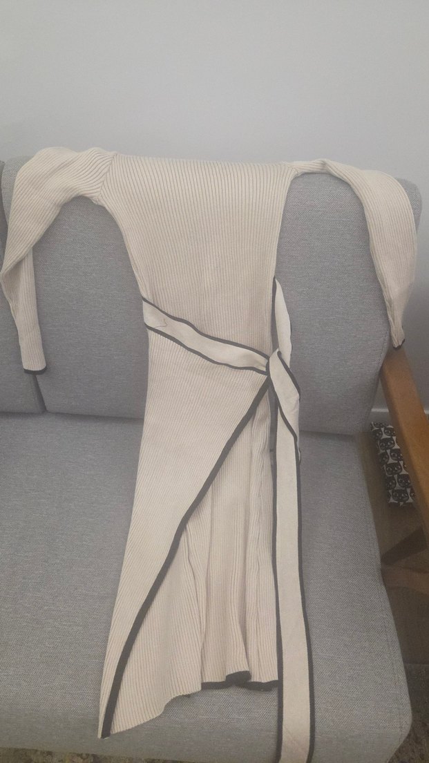 Hiç giyilmedi, dar olduğu için satıyorum. Uzun, vücuda oturan triko elbise, önü bağlamalı tasarıma ve uzun kollara sahiptir. Krem/taş renkte modern tarzda, günlük kullanım için uygundur. Boyu omuzdan itibaren 110 cm esnek trikodur, üstünüze yapışmasını sorun etmezseniz M bedene de olur.