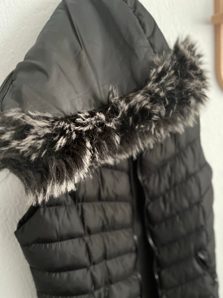 Yüksek yakalı, kolsuz ve uzun kesim olan bu siyah kadın yelek, sentetik kumaş ve kürk detaylarıyla dış mekan için uygundur.