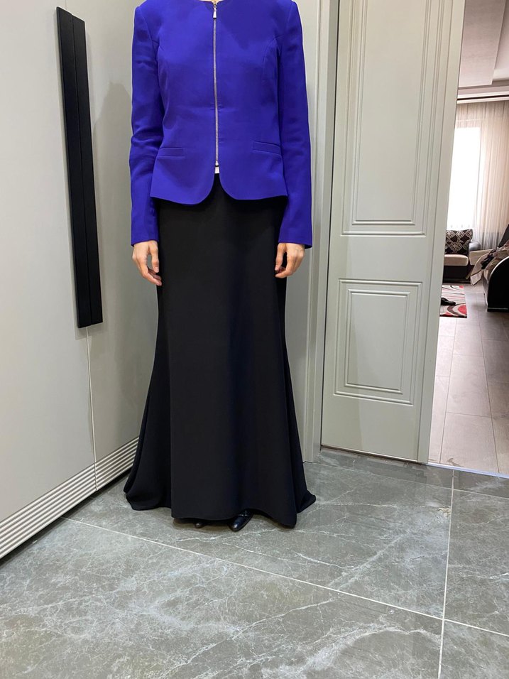 Uzun kesim, regular fit mor ceket, drapeli detaylıdır ve siyah, desensiz etek ile kombinlenmiştir. İş ortamı için uygun, şık ve çağdaş tasarımdadır.