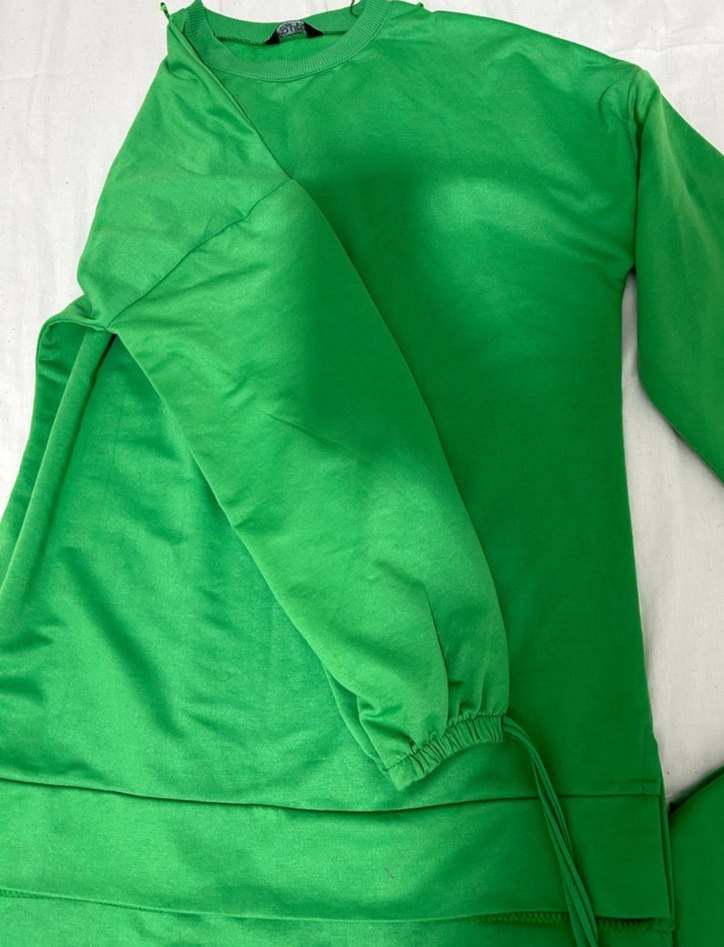 Kadın sweatshirt, uzun kesim, bol ve uzun kollu. Parlak yeşil renkte, sentetik kumaştan drapeli ve günlük kullanıma uygun.