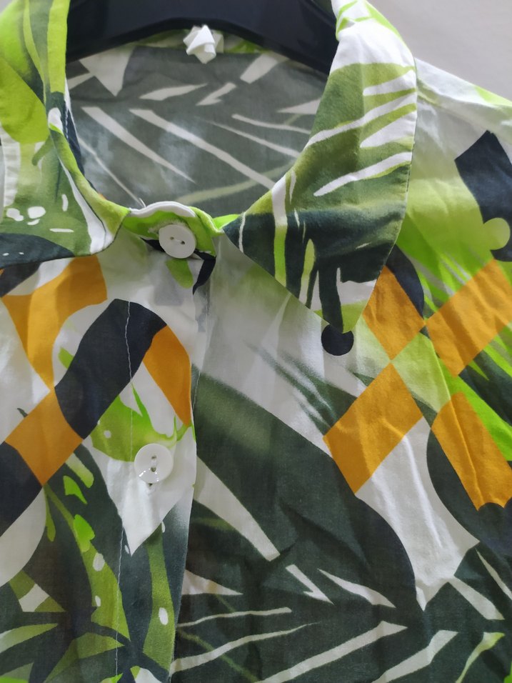 Renkli batik desenli, kısa kollu, düğmeli ve bol kesim uzun kadın gömleği. Sokak stiline uygun, rahat ve şık bir seçim.