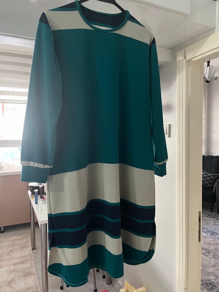 Uzun kesim, bol tunik, uzun kollu ve kayık yakalıdır. Turkuaz ve gri renk bloklarıyla yumuşak ve sıcak kumaştan üretilmiştir. Günlük kullanım için uygundur.
