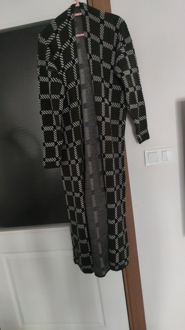 Uzun kesim koyu yeşil desenli kadın hırka. Notch yakalı ve uzun kollu, rahat sokak stili için uygun. Rahat sentetik kumaş, günlük kullanım için i