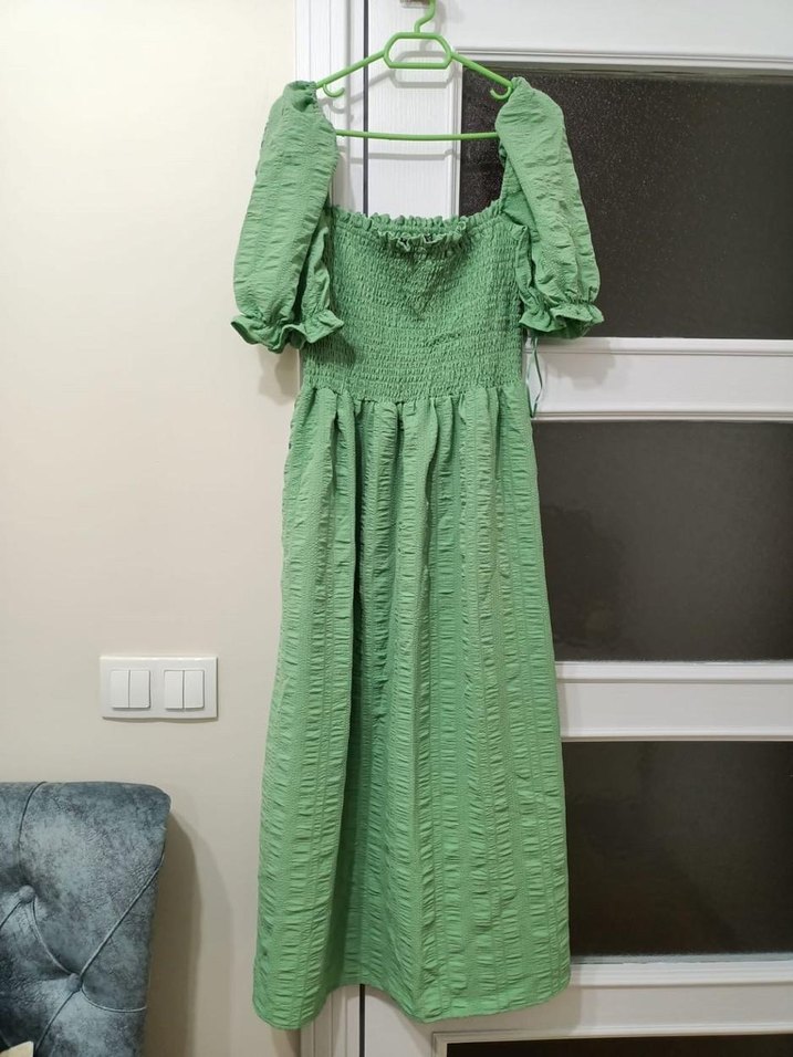 S beden hiç kullanılmadı etiketli.Bol kesim, askılı, pileli detaylara sahip yeşil keten elbise, bohem tarzı için uygun.