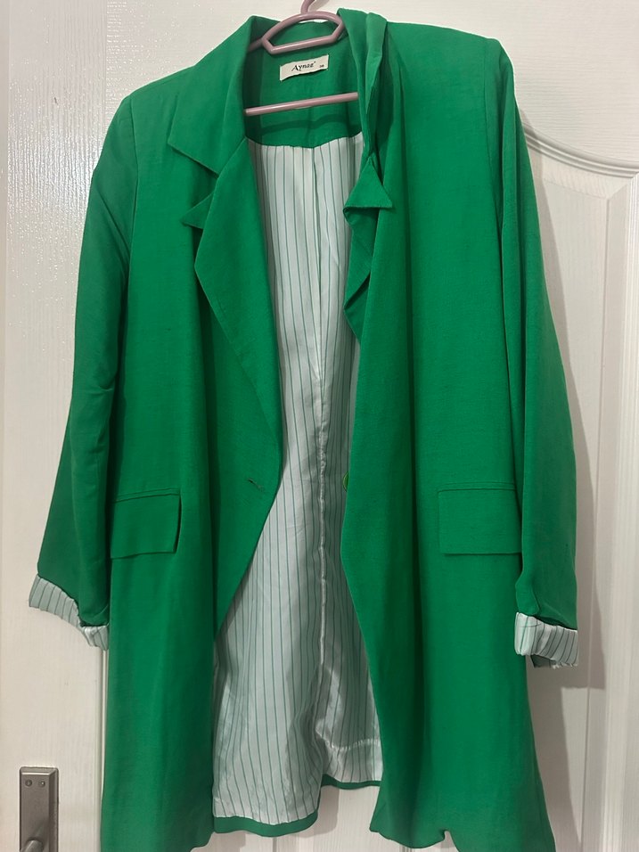 Uzun Kesim Yeşil Keten Kadın Blazer