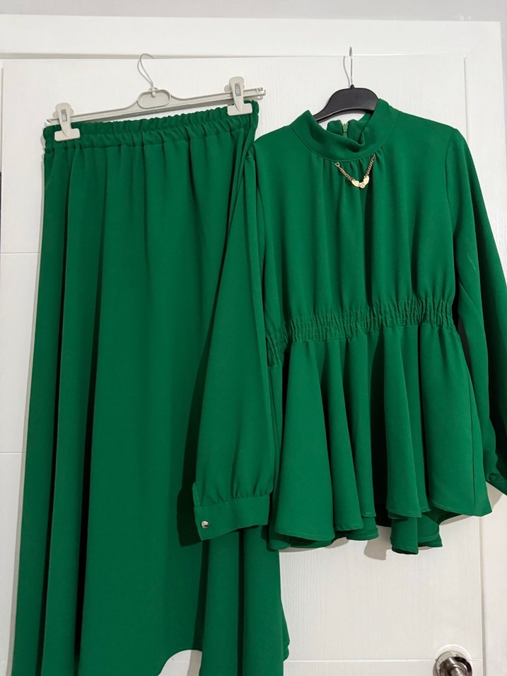 Uzun kesim yeşil kadın takımı, salaş ve drapeli tasarıma sahiptir. Uzun kollu, yüksek yakalı ve parlak dokuludur, ofis için uygundur. Oldukça temizdir son fiyattır