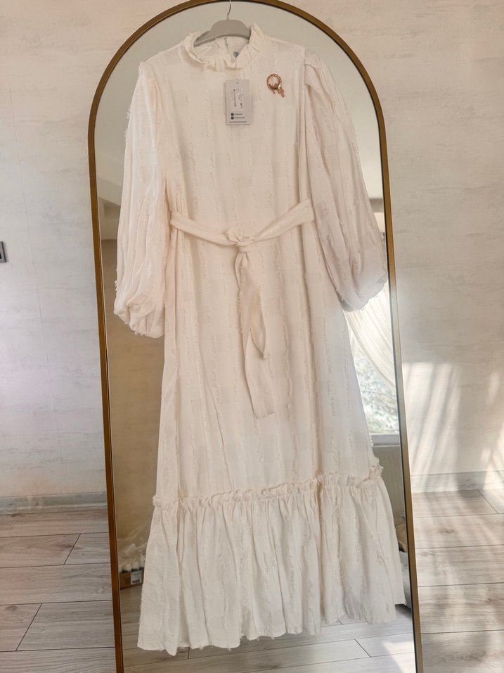 Uzun beyaz keten elbise, fırfırlı detaylar, yüksek yakalı ve askılı kollu, bol kesim bohem tarzda, düğünler için de doğum günü tarzı veya tatillerde rahatlıkla tercih edebilirsiniz instagram butik sayfamı kapatıyorum ürünlerimi zararına yükledim elimden çıkarıyorum bu fiyatlara kaçırmayın bu elbisenin 1 ve 3 bedeni kaldı sadece 1 beden 36 3 beden 42 bedenle uyumludur