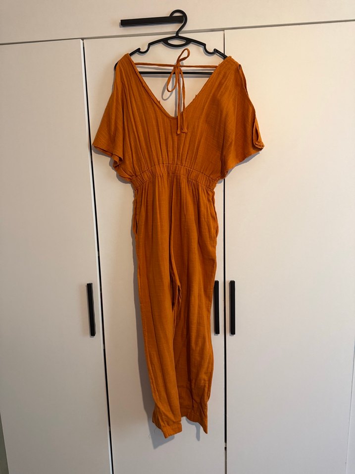 Hardal rengi, keten bohem havalı, kol omuz detaylı, önü arkası v yaka, oldukça rahat bir duruşa sahip, cepli