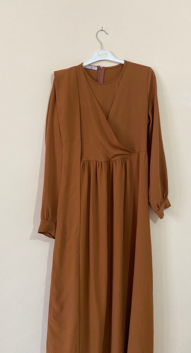 Bej renkte, keten kumaştan uzun, V yaka ve uzun kollu salaş kesim elbise. Minimalist, bohem tarzıyla günlük ve modest kullanıma uygundur.