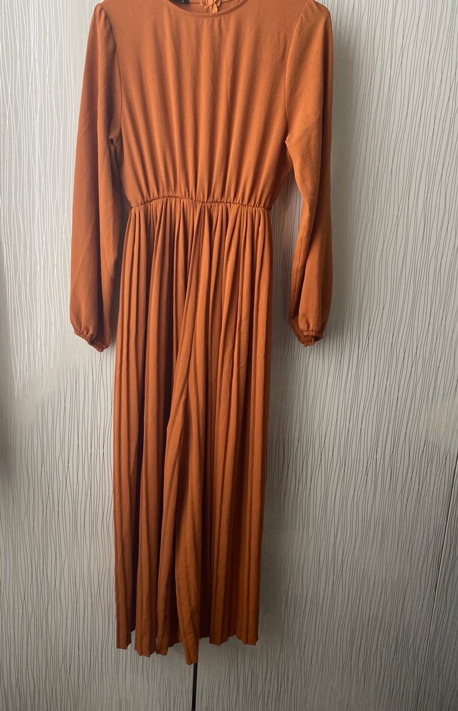 Yumuşak keten kumaştan, uzun kollu ve yüksek yakalı kiremit rengi uzun elbise görünümlü tulum Salaş kesim ve pile detaylarıyla günlük,nişan,kına,düğün için uygundur.