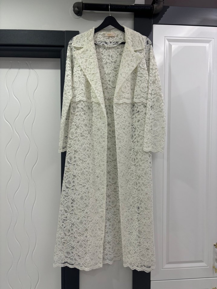 Uzun beyaz Fransız dantel işlemeli kadın trençkot, uzun kollu ve rahat kesimlidir. Bohem Paris tarzıyla şıklık katar. 38-40 beden giyenler tercih edebilir. Farklı bir tarzı vardır. Fark yaratmak isterseniz bu trençkot tam sizlik