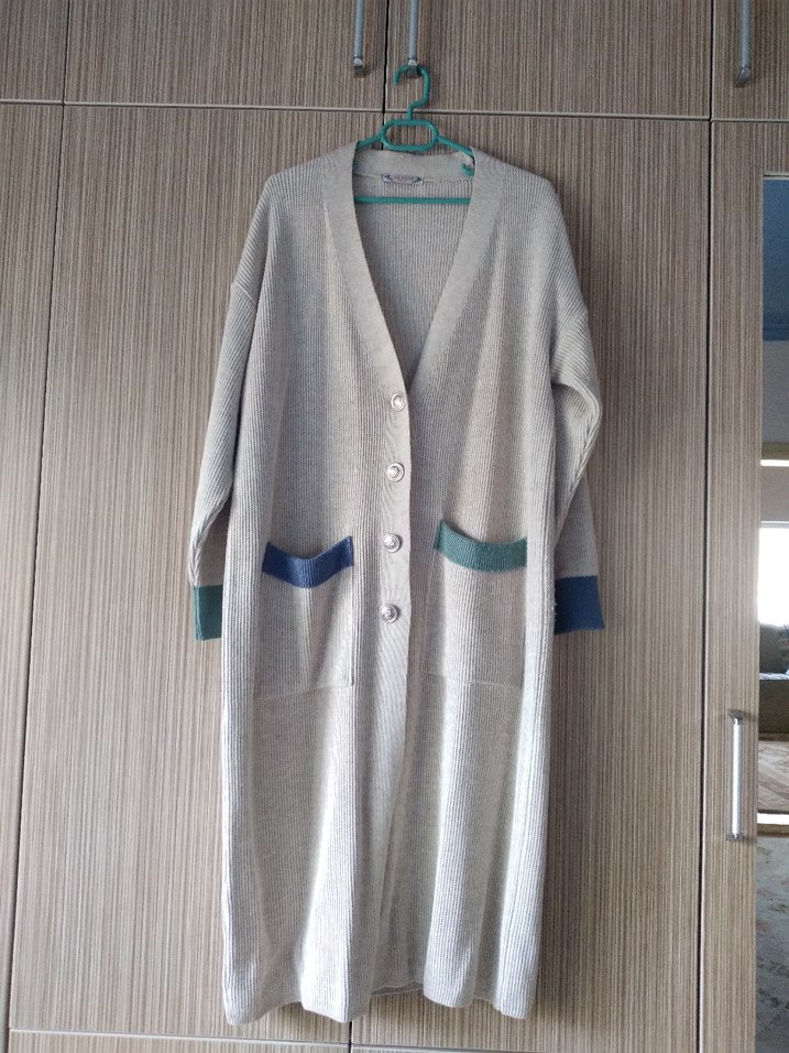 Uzun, kırık beyaz triko kadın hırka, bol kesim düğmeli. Uzun kollu, iki kontrast cepli rahat bir modeldir . Boy 110 göğüs 56 santim