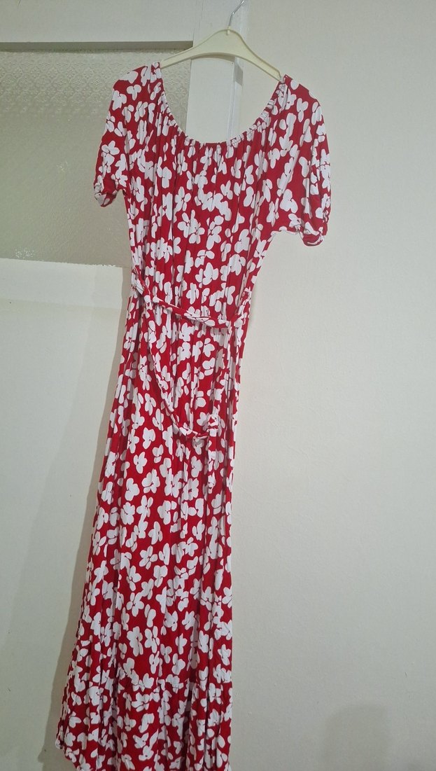Bu uzun, bol kesim bohem elbise, renkli kırmızı-beyaz batik deseni, kayık yaka ve askılı kollara sahiptir, günlük kullanım için uygundur.