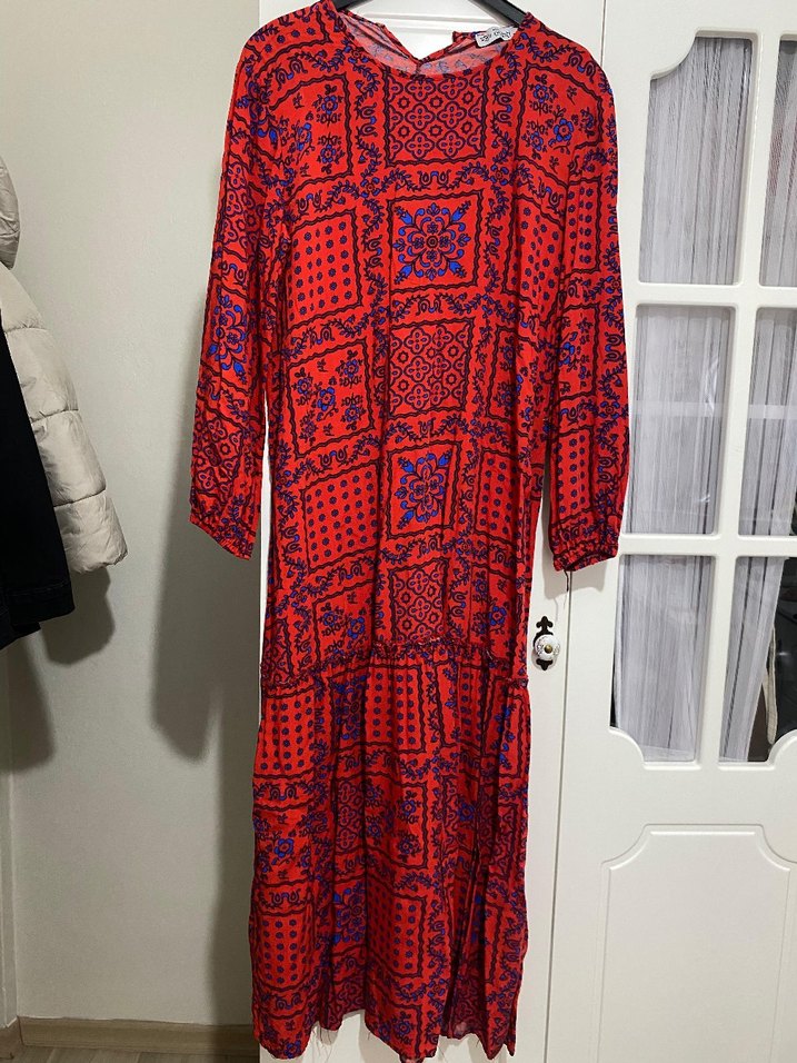 Uzun kırmızı elbise, renkli bağlama desenli, bol kesim ve uzun kolludur. Yuvarlak yaka ve drapeli tasarımıyla bohem tarzını yansıtır.