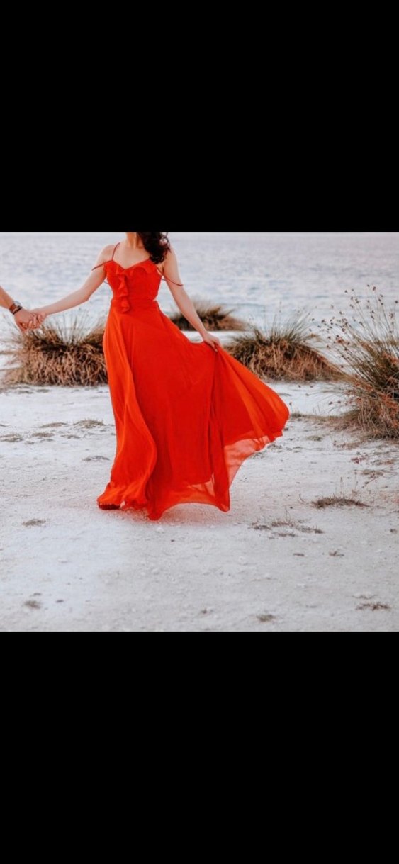Parlak kırmızı bohem tarzda, bol kesim uzun elbise, askılı kollara sahip, düğünler için uygundur.