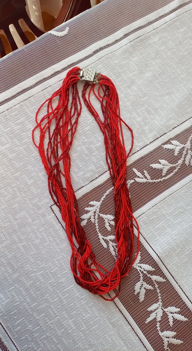 Uzun, kırmızı boncuklardan oluşan bu kolye renkli batik desenli olup bohem tarzına uygundur, günlük kullanıma idealdir.