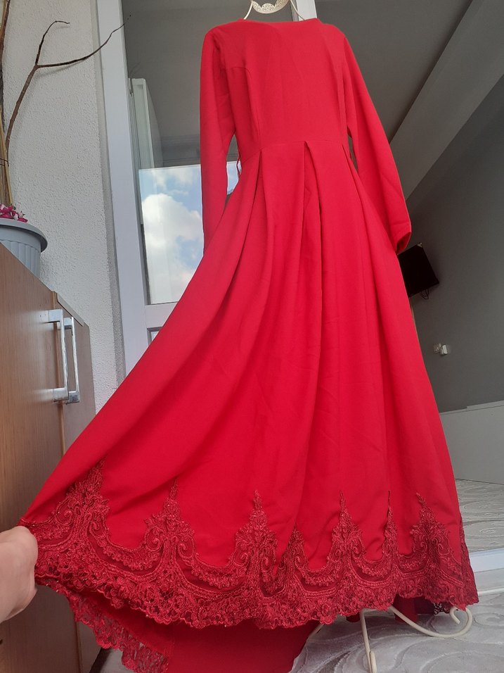 Uzun kollu ve bisiklet yaka, yumuşak sentetik kumaştan yapılmış kırmızı renkli uzun elbise. Bol kesim ve drapeli, renkli nakış detaylı, düğün gibi özel anlara uygun.