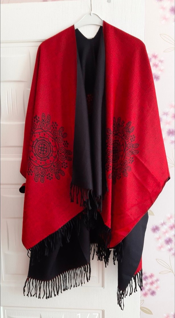 Uzun, straplez kadın panço, bol kesim ve uzun kolludur. Yumuşak kumaştan yapılmış, koyu kırmızı desenli, püsküllü ve drapeli bohem tarzda rahat bir üründür.