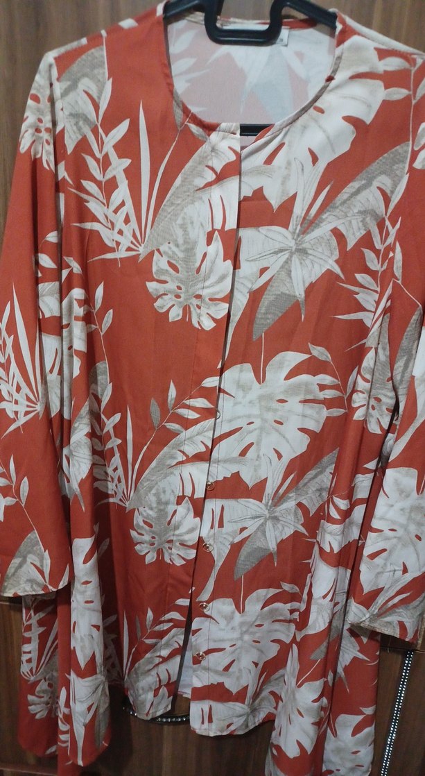 Uzun kırmızı kimono, bol kesim ve dökümlü tasarıma sahiptir. Beyaz bitki desenleri baskılıdır. Uzun kollu ve V yakalıdır, bohem tarzı için uygundur.