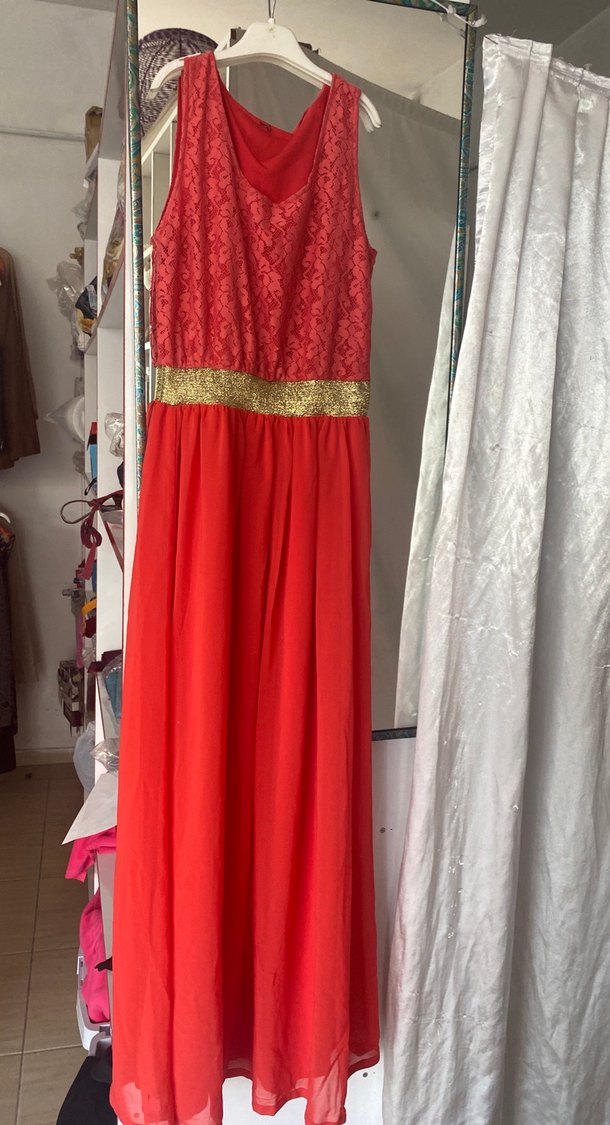 Uzun Kırmızı Drapeli Abiye Elbise