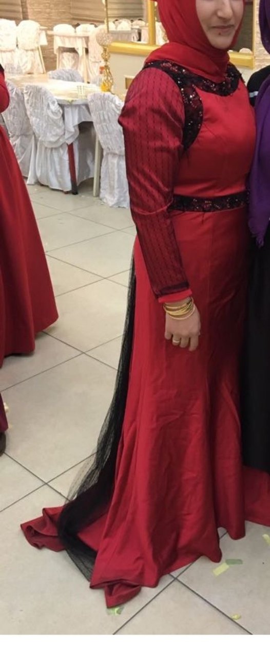 Koyu kırmızı, desenli kumaştan uzun ve fitted kesim kına elbisesi. Drapeli, uzun kollu ve kayık yaka detaylı, gotik düğünlere uygun. Kuru temizleme yapılmıştır. 42 beden giyenede olur.