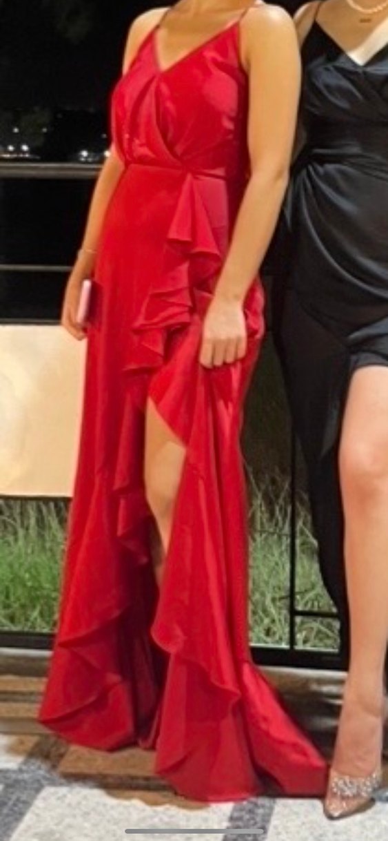 Bu dar kesim, uzun kırmızı abiye parlak kumaş ve drapeli tasarıma sahiptir. V yaka ve askılı kolludur, düğün için uygundur. 160 boy 52 kiloda görseldeki gibi görünüyor saten kumaş