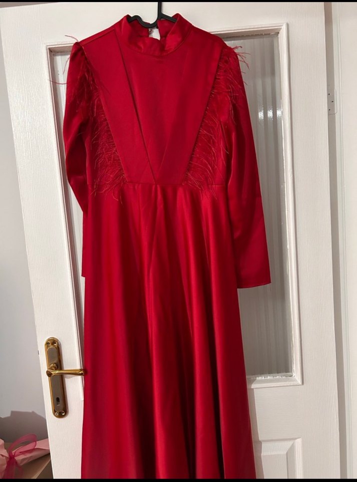 Uzun kırmızı abiye elbise, drapeli tasarımı, V yaka ve uzun kollu. Parlak yüzeyli, klasik modern ve vintage tarzı harmanlayan, düğünler için uygun. 36 beden diyor ama 38 beden de gayet rahat giyer hatta ben 40 bedenken giydim üst bedenim geniş olmadığı için rahattı