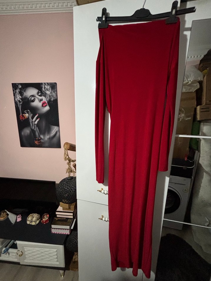 Uzun kırmızı elbise, dar kesim ve uzun kollu. Teknolojik kumaştan, minimalist drapeli tasarıma sahip, romantik akşamlar için uygun. S,m bedenler için uygundur likralıdır