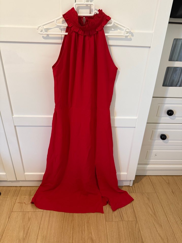 Yüksek yakalı, drapeli detaylı, yırtmaçlım kolsuz uzun kırmızı abiye elbise. Minimalist ve çağdaş tarzda, romantik akşamlar için uygun.