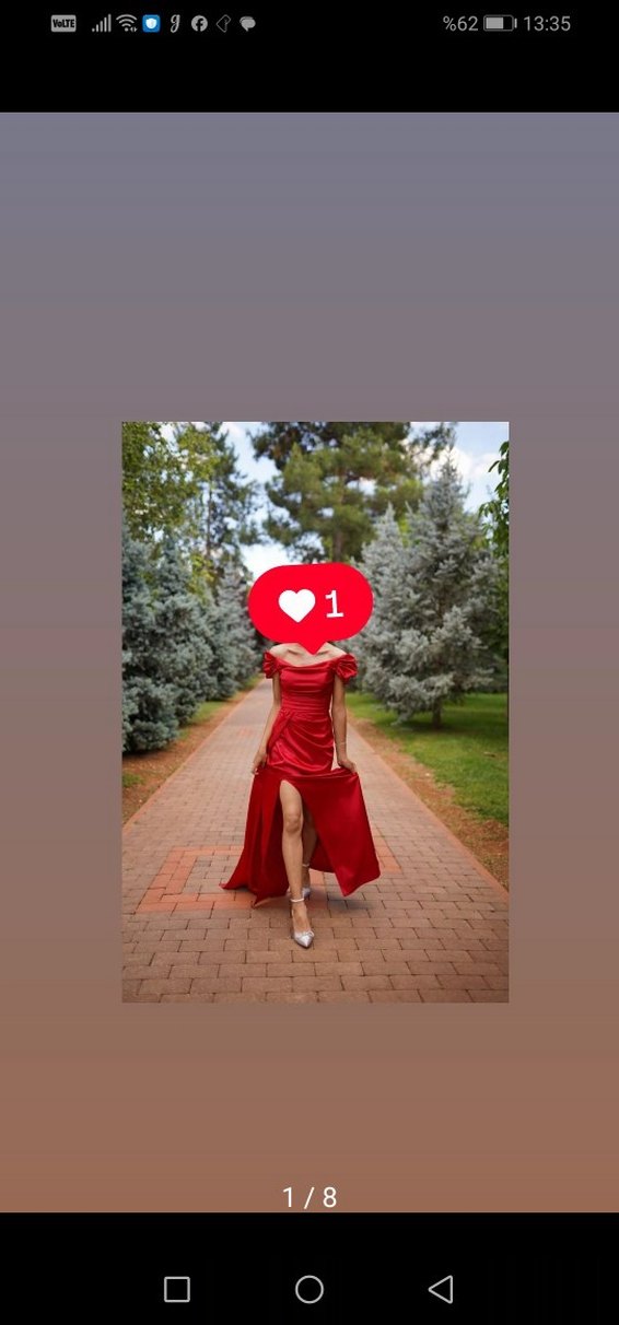 Uzun, kırmızı, straplez yakalı ve drapeli detaylara sahip abiye elbise. İnce askılı kollu ve parlak dokusu ile modern klasik tarzda, düğün için uygun. Sadece 3 saat giyildi