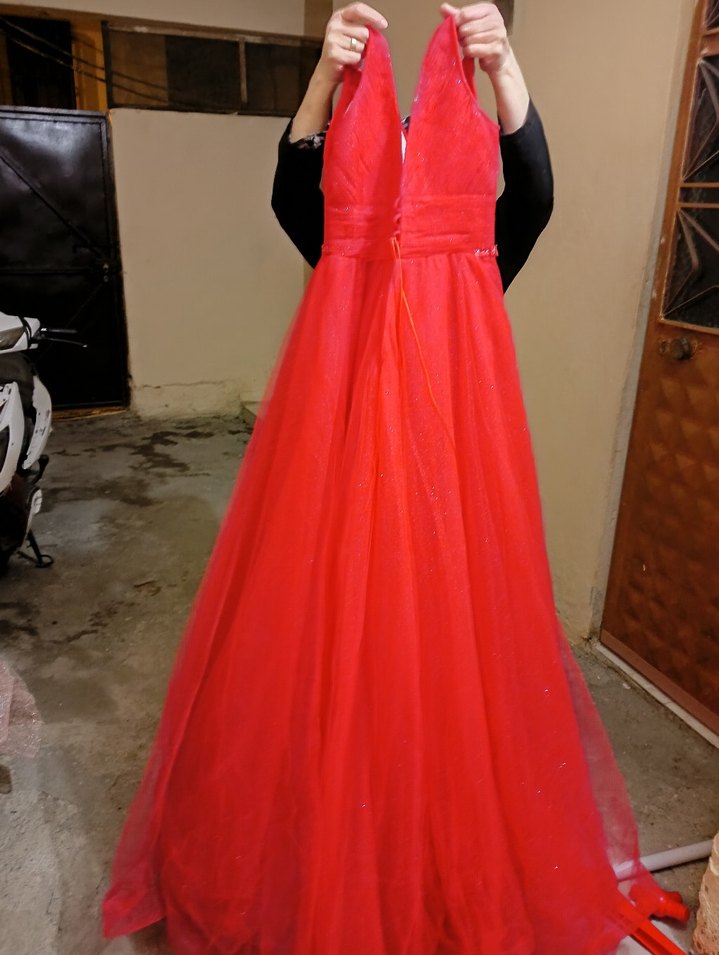 Uzun, dar kesim kırmızı abiye, straplez ve kolsuz tasarıma sahiptir. Drapeli ve parlak yapısıyla gotik düğünlere uygun avant-garde bir stildir.