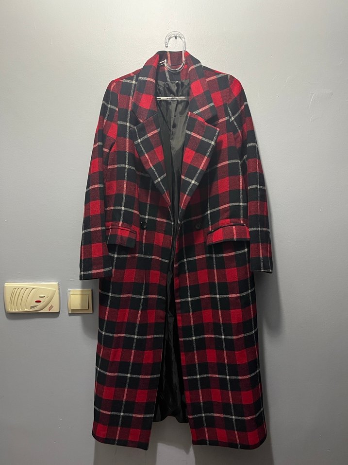 Uzun, kırmızı ekose desenli kadın kabanı, düğmeli ve kesik yakalıdır. Defosuz ve tertemizdir.
