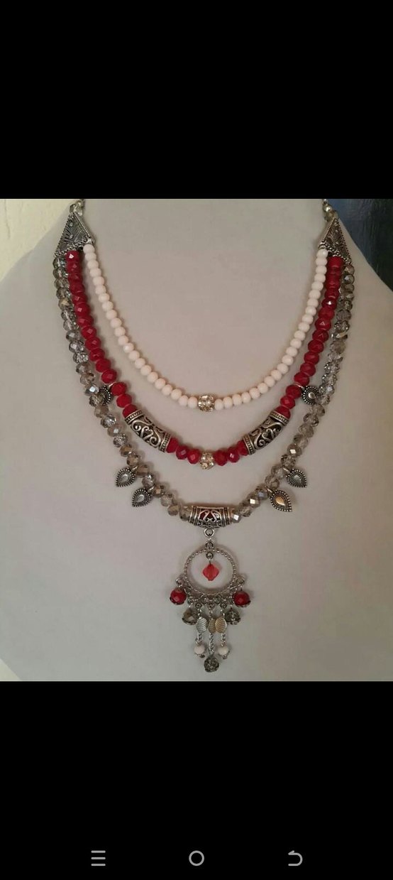 Kırmızı ve beyaz boncuklarla etnik desenli, gümüş tonlu süslemelere sahip uzun bohem kolye.