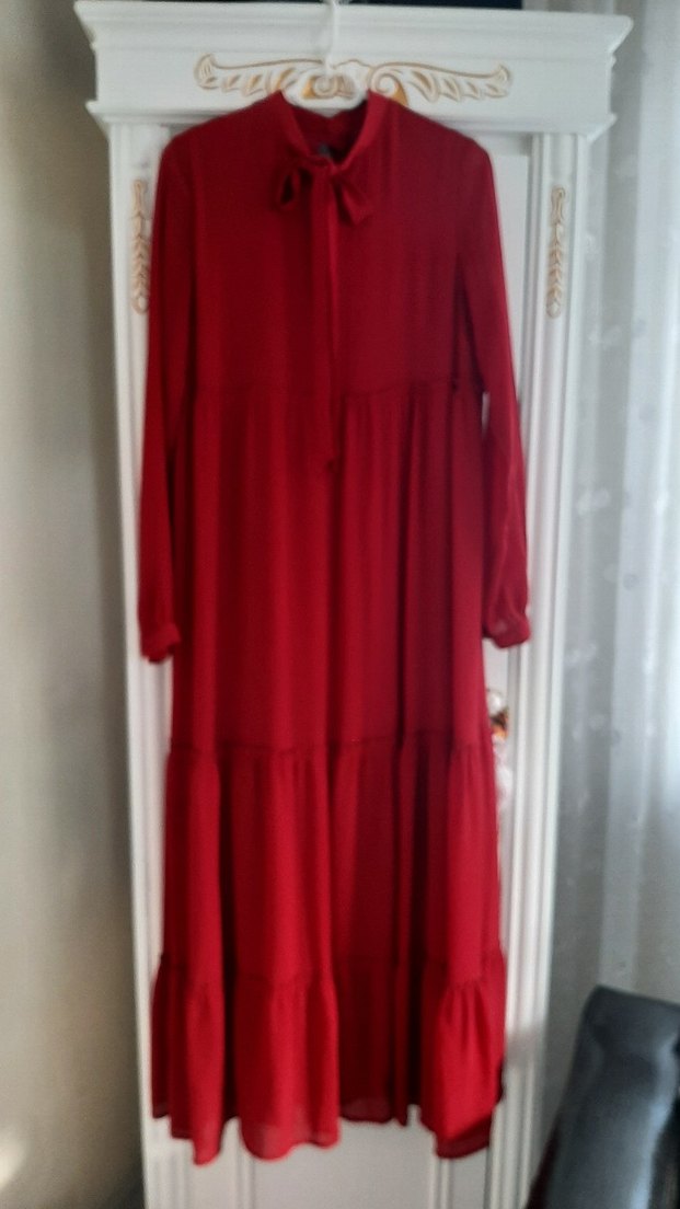 Uzun kırmızı elbise, yüksek yakalı ve uzun kollu, bol kesimdir. Fırfır detayları ve bohem tarzı ile yumuşak sentetik kumaştan yapılmıştır.