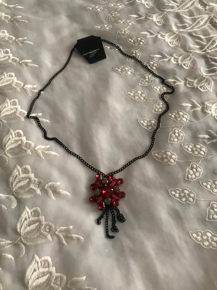 Uzun, koyu kırmızı renkte, gotik tarzda boncuklu kolye. Nakışlı desenli, romantik akşamlar ve avant-garde modaya uygun.