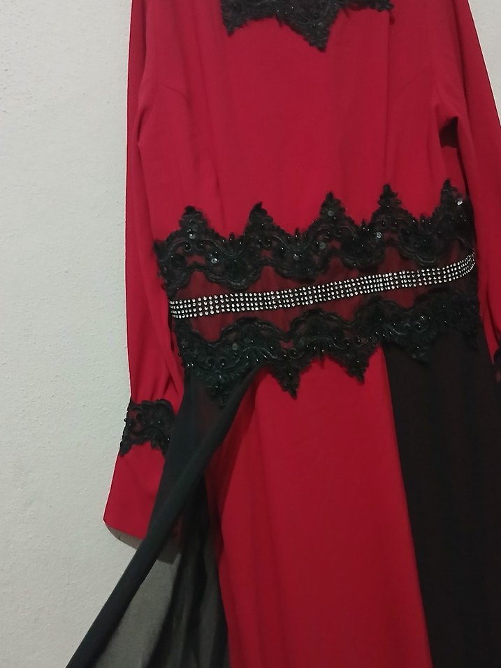 Drapeli ve siyah işlemeli detaylara sahip, uzun ve fitted kırmızı abiye elbise. Kayık yaka ve askılı kolludur, düğünler için uygundur.