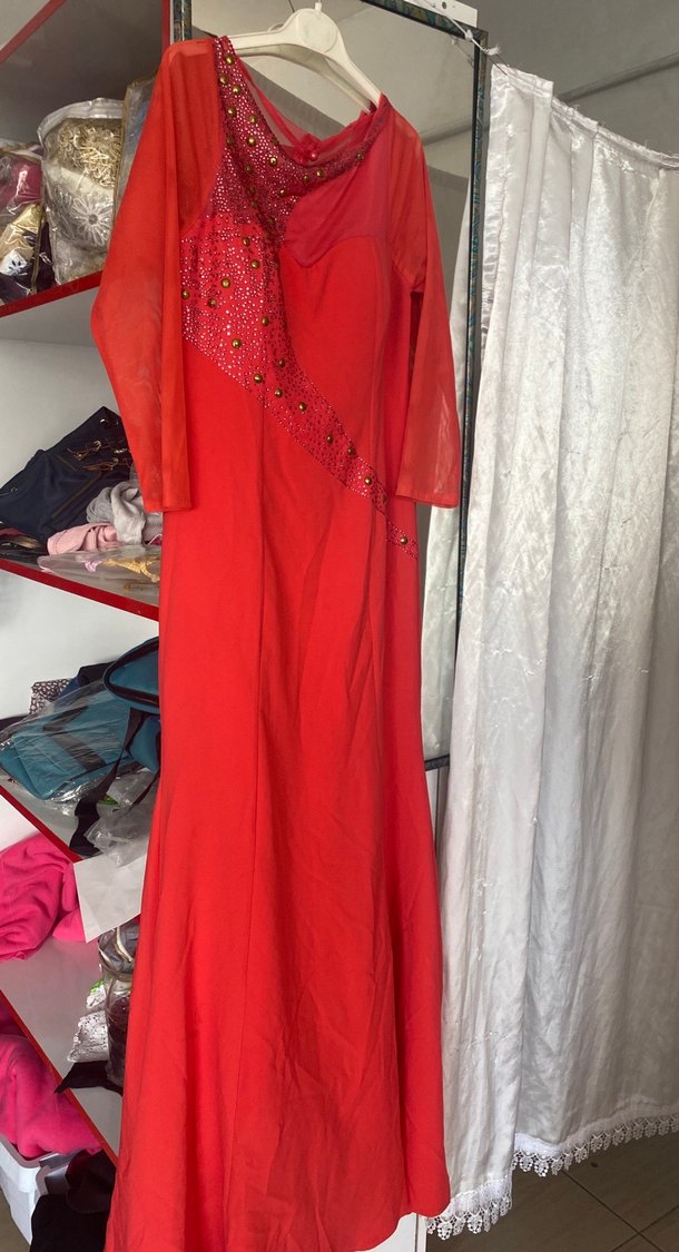 Uzun Kırmızı İşlemeli Kadın Abiye Elbise