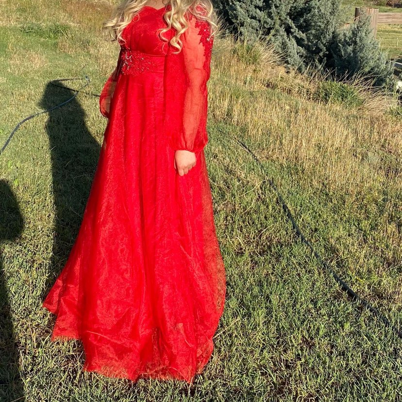 Uzun, kırmızı, işlemeli, straplez yaka ve uzun şeffaf kollu, drapeli, vücuda oturan kına elbisesi. Düğünler için bohem ve gösterişli bir tasarım. Marka öne çıkması için seçtim