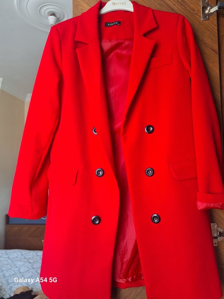 Uzun, kırmızı, düğmeli ve kesimli yaka detaylı kadın blazer ceket. Uzun kollu, rahat kesimli ve yumuşak, sıcak kumaştan üretilmiştir.