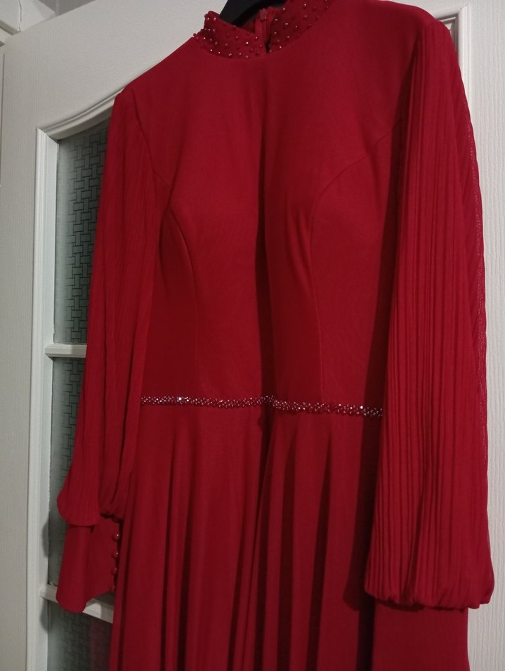 Parlak kırmızı sentetik kumaştan, uzun kollu ve yakası kesik detaylı,taşlı, drapeli uzun oturan kadın elbisesi. Düğünler için uygundur.