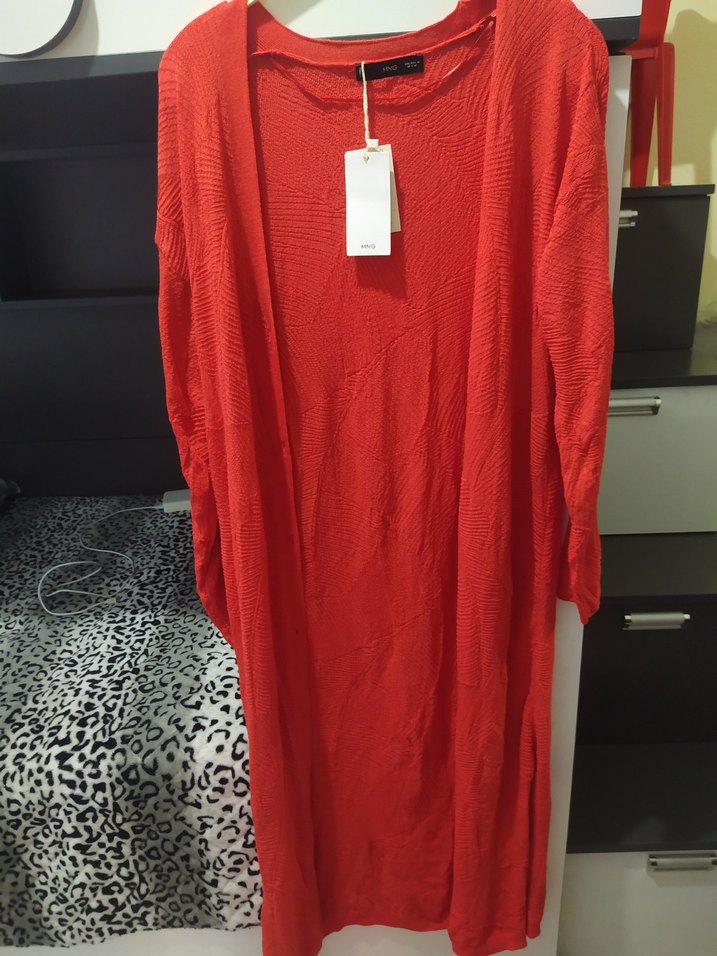 Sentetik kumaştan, uzun, bol kesim, yuvarlak yakalı kırmızı örme kadın hırka. Günlük ve rahat sokak stiline uygun.