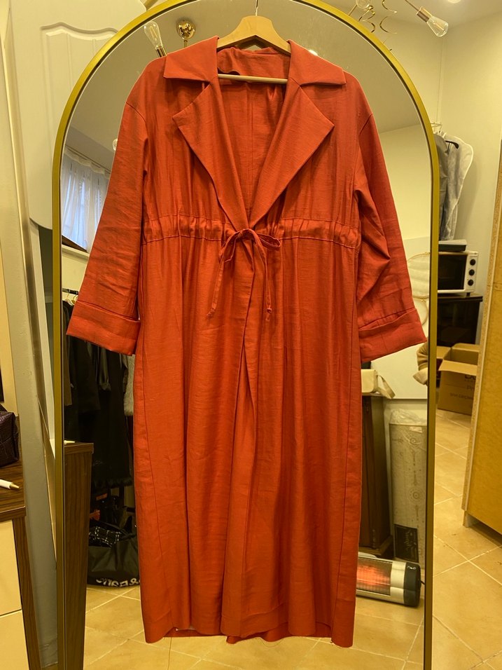 Uzun, bol kesim kadın kap Uzun kollu ve belden bağlamalı, desen içermeyen yumuşak kumaştan.