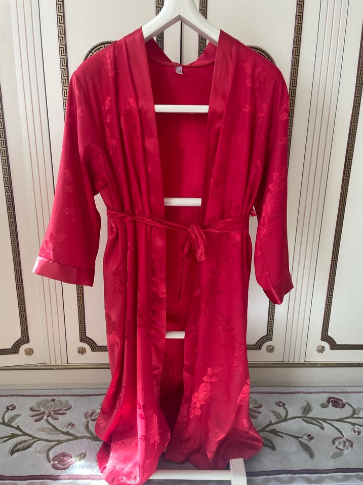 Uzun boylu, kırmızı renkli kadın sabahlığı, bol kesim ve ip askılı kollara sahiptir. Rahat ve renkli, desensiz tasarıma sahiptir, kemerle ayarlanabilir.