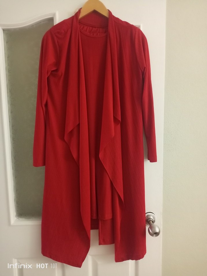 Uzun kırmızı kadın palto, kıvrımlı tasarım ve uzun kollu, kesik yakalıdır. Rahat kesimi ve yumuşak, kumaşı günlük kullanım için uygundur. üçlü takım